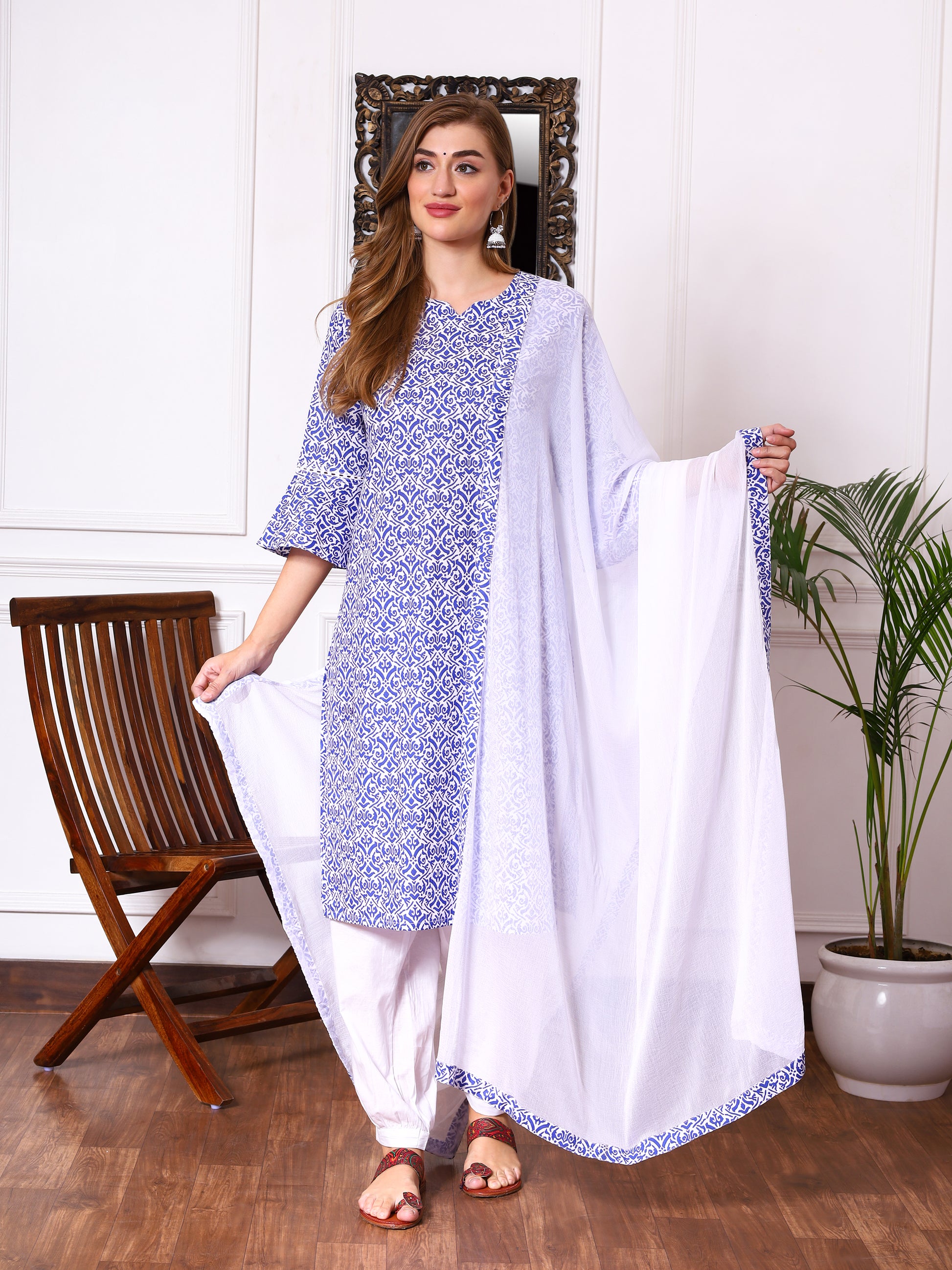 Refresh your ethnic wardrobe with this elegant Blue and White Kurti Pant Dupatta Set, designed to blend timeless charm with everyday comfort. The beautifully crafted kurti features soothing blue and white tones that create a fresh, graceful look, while the matching pant ensures ease of movement and a flattering fit. Completing the ensemble, the coordinated dupatta adds a touch of sophistication and traditional appeal.