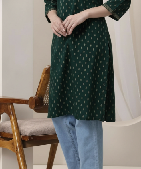 Add a touch of effortless elegance to your everyday wardrobe with this Green Printed Cotton Kurti. Crafted from soft and breathable cotton fabric, this kurti features beautiful prints on a soothing green base, creating a fresh and timeless look. The comfortable silhouette makes it perfect for all-day wear while keeping you stylish and relaxed.