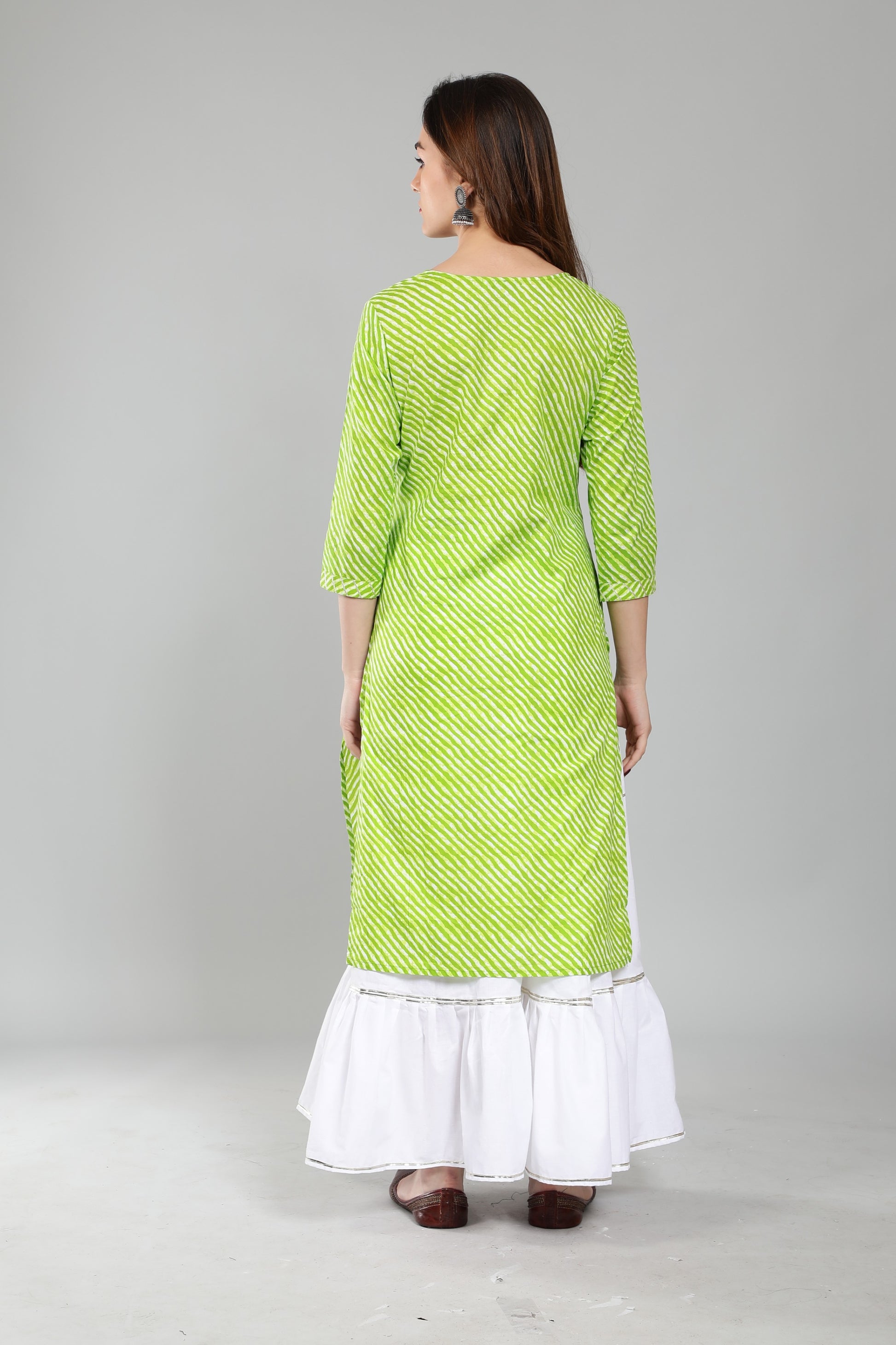 Featuring the traditional Leheria pattern — a classic Rajasthani tie-dye technique known for its beautiful wave-like stripes — this kurti blends heritage charm with modern simplicity. The soft, lightweight fabric drapes gracefully, while the vibrant colors and intricate patterns add a refreshing touch to your wardrobe.