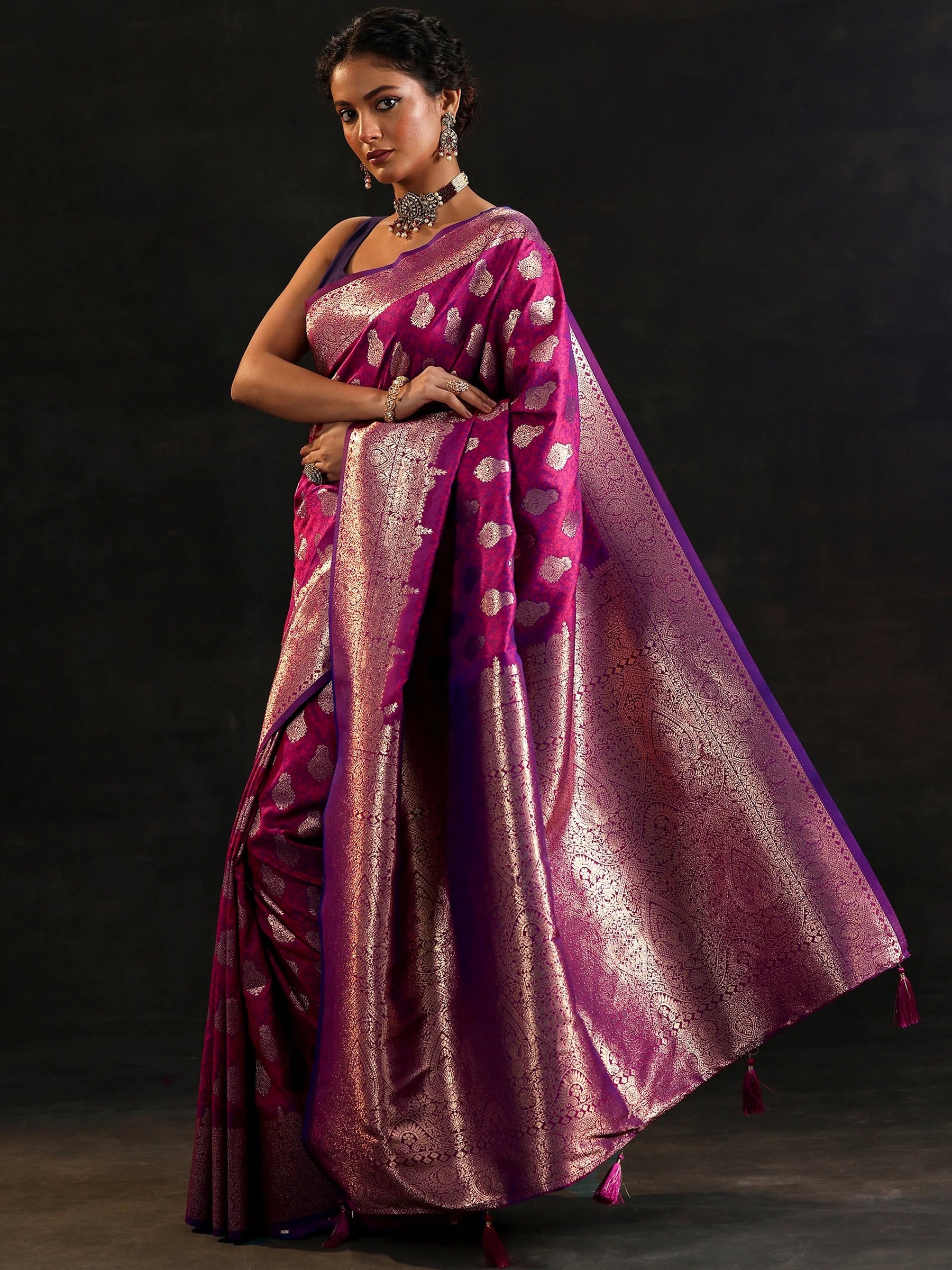 Magenta Woven Design Banarasi Silk Blend Saree With Unstitched Blouse Piece