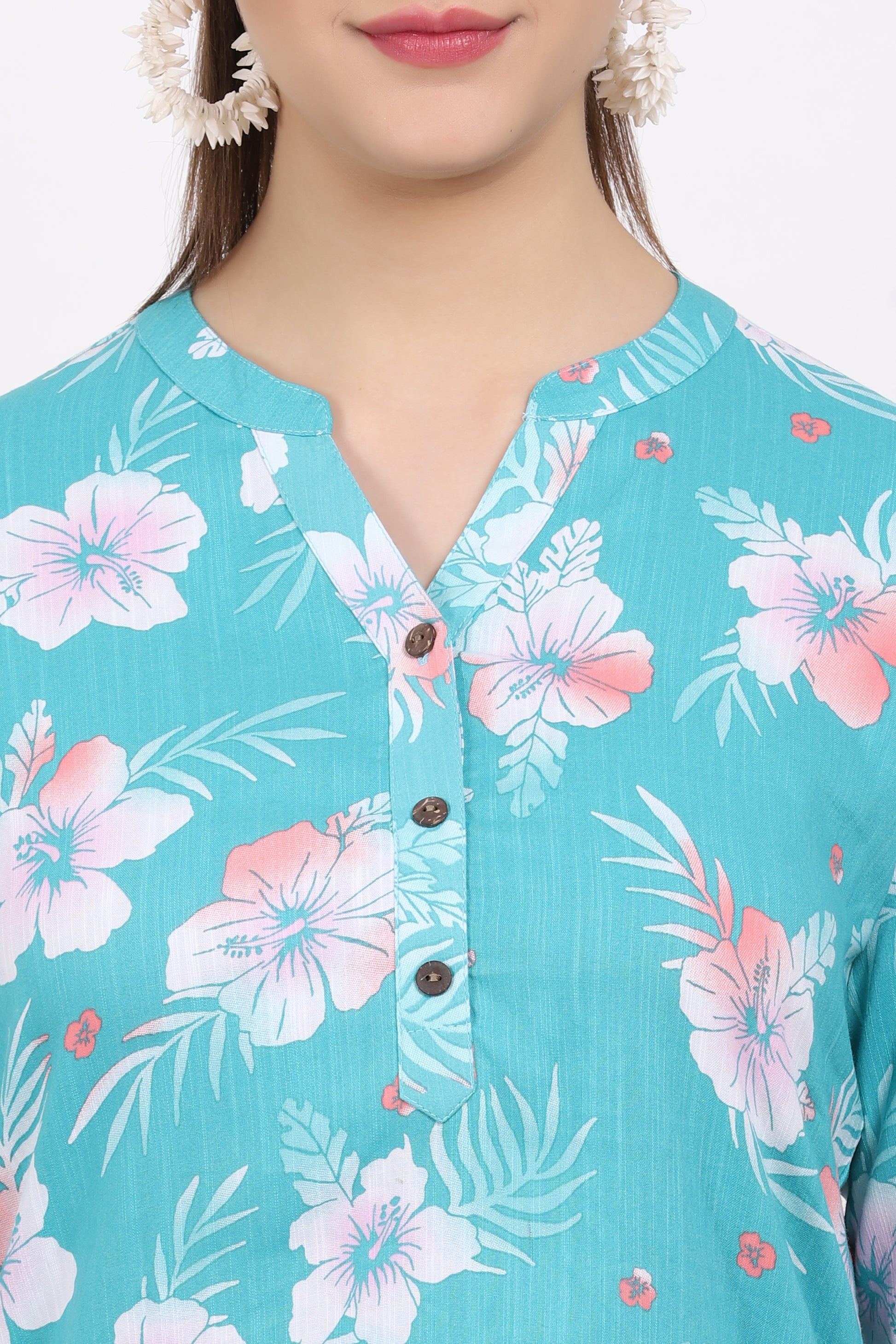 Bring a fresh pop of color to your wardrobe with this elegant Turquoise Blue Printed Viscose Tunic Top. Crafted from soft, breathable viscose fabric, it offers a smooth feel and a graceful, flowy drape for all-day comfort. The vibrant turquoise blue shade paired with delicate prints adds a lively yet sophisticated touch, making it ideal for both casual days and smart outings. The flattering tunic length ensures effortless styling with leggings, pants, or jeans.